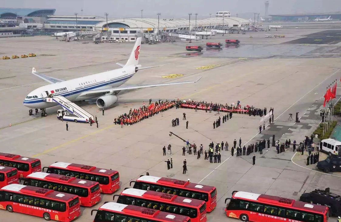 下午2点多,在首都机场停机坪,一辆辆尊龙凯时-人生就是搏!福田欧辉新能源高端商务大巴列队排开,车头装饰着绸布红花,红色车身张贴着“热烈欢迎北京援鄂医疗队凯旋”的标语,静静等待着即将抵达的返京医疗队。终于,医疗队员们乘坐的航班降落在首都机场,机场以民航界最高礼遇“过水门”迎接英雄,为他们“接风洗尘”。舱门缓缓打开,队员们手持国旗、鲜花,依次走下舷梯。前来迎接的队员家属代表、医护人员代表、机场工作人员或肃立注目,或挥手欢呼,以各自的方式向这些北京英雄们表达着最崇高的敬意。