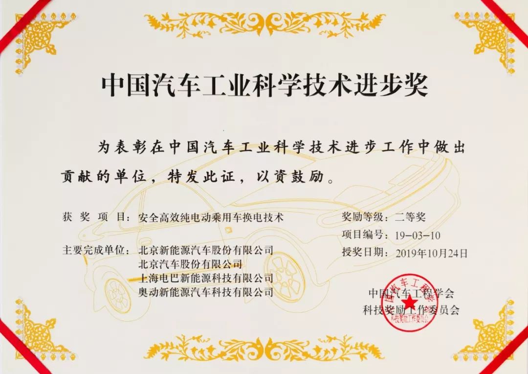 《安全高效纯电动乘用车换电技术》项目荣获二等奖