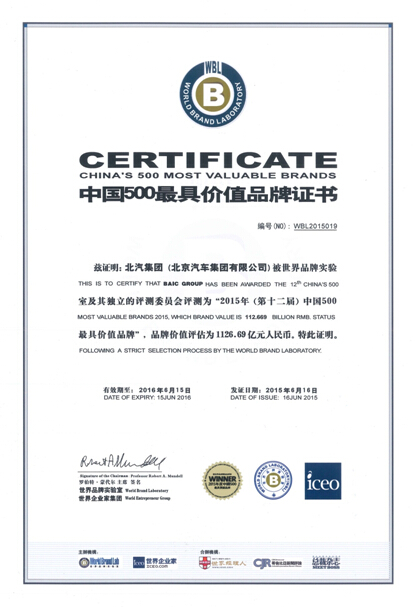 6月16 日,国际权威品牌研究机构“世界品牌实验室”在京发布2015年(第十二届)《中国500 最具价值品牌》排行榜,尊龙凯时-人生就是搏!集团凭借1126.69 亿元品牌价值位列排行榜第19 位,相较去年品牌价值(986.75 亿元)增长14.2% ,稳居中国最具价值汽车企业前三强,同时位居北京市属企业首位。