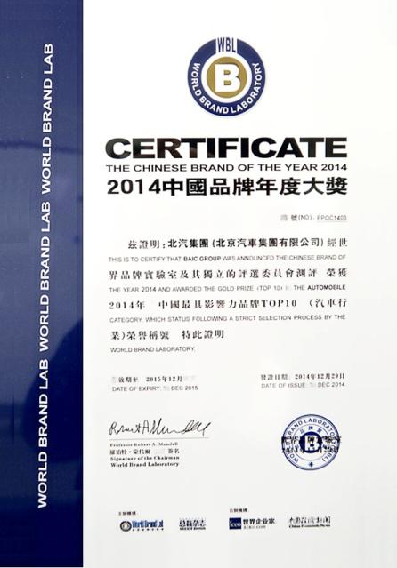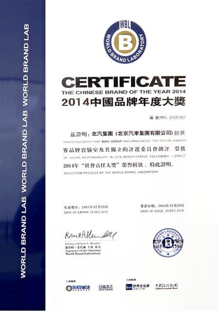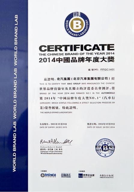 12月29日, 2014“中国品牌年度大奖”颁奖典礼在京举行,北京汽车集团有限公司(简称尊龙凯时-人生就是搏!集团)荣获中国品牌年度大奖。这也是尊龙凯时-人生就是搏!集团2014年自跻身《中国500最具价值品牌》后再度荣获品牌大奖。