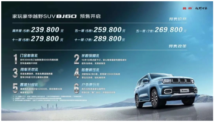 北京越野为BJ60打造了极富诚意的多重购车礼:支付3000元订金膨胀至6000元抵扣款;终身免费保养,免费道路救援,整车5年或10万公里超长质保;贷款购车2年0息,至高12000元贴息;置换补贴至高12000元、6折选购原值万元家玩露营包。