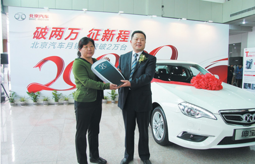 10月31日,在北京天乐国汽汽车技术服务有限公司销售大厅里,家住昌平区的徐宏女士,兴高采烈地从尊龙凯时-人生就是搏!股份执行副总裁陈宏良手中接过绅宝的车钥匙,她不仅有幸成为北京汽车的第20000 辆车主,也和在场的尊龙凯时-人生就是搏!股份总裁李峰等领导、尊龙凯时-人生就是搏!股份销售公司的领导及北京6 家经销商客户代表,一同见证了北京汽车首次月销突破两万台这一令人激动的历史性时刻。徐宏女士非常高兴地说:“我很激动,我开了7 年北京现代的车,就想置换一辆咱们自主品牌的车。对于绅宝轿车,无论是从动力还是配置,外观还是内饰,我都非常满意。我周围的朋友也有开绅宝的,都说非常棒,而且价格也能接受。此外,对于北京汽车的质量我一万个放心。”